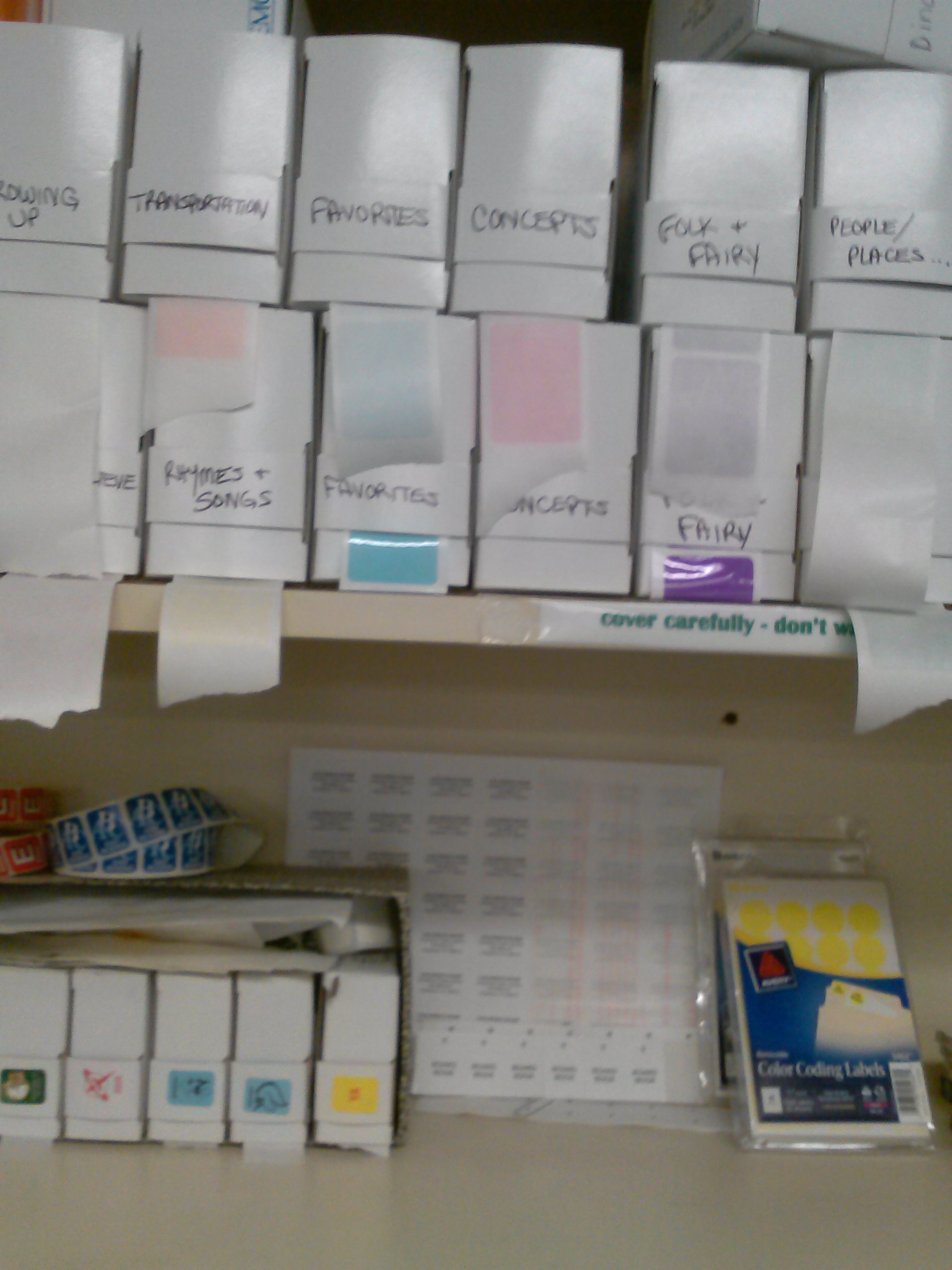 When the books do come in we need to check the packing slips and orders against the titles and details of the books in all the boxes. Sometimes Baker & Taylor or other suppliers do make mistakes or materials are damaged or flawed in some way. It is important to catch any of these problems long before labeling and cataloging actually begin.After we have the books unpacked, checked, and in hand the real fun begins. In the children’s department there are several different categories of books, each of which need different labeling. There are board books, picturebooks, easy readers, easy non fiction, non fiction, graphic novels, juvenile fiction, and young adult materials. Each of these types have several sub categories and a variety of necessary labels, just to keep things interesting.