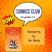This month we’ll make instruments in addition to discussing the book, Stargazing by Jen Wang. Please read the book before attending this virtual event. Copies of the book and craft materials are available at the children’s information desk starting on Feb 22. For kids in grades 3-5. You must register for each child in order to pick up a copy of the book and craft supplies. Registered participants will receive a link to the Zoom meeting 1 hour prior to the event start time.