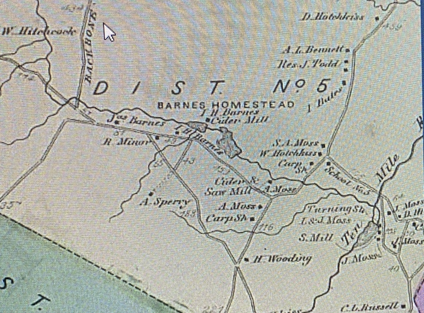But I am a determined researcher, and after decades of waiting for an internet to be built and the right information to be loaded onto it, I hit paydirt. I came across an old map of Cheshire, from 1868, that not only showed a cider mill, but two cider mills on what is actually known as Cuff Brook (no one ever knew it had a name, it was just The Brook). The T. H. Barnes Homestead still stands, built in 1817 (we knew it as the Bear’s House, because the Bears lived in it at the time, but the Barnes family took it back, and I know this because one of the Barnes was my babysitter), and these pillars may very well have been part of their old property (they have a small pond by the house, but no waterfall to turn a wheel). I believe the house marked Jos. Barnes is the one on the corner of Huckins and Hickory Lane, which dates from 1742, and has an entire tree as a crossbeam (because I used to babysit the kids in that house. Maybe we need a book called The History of Cheshire Through Babysitting). I find it amusing that the same streets are already there, including the unpaved Moneta Lane across from Winslow, and that across the street from the newly built Barnum School at Marion and Jarvis is a label of “School No. 5.” (The Hotchkiss house across from it dates from 1805, and still stands). The more things change, the more they remain the same.