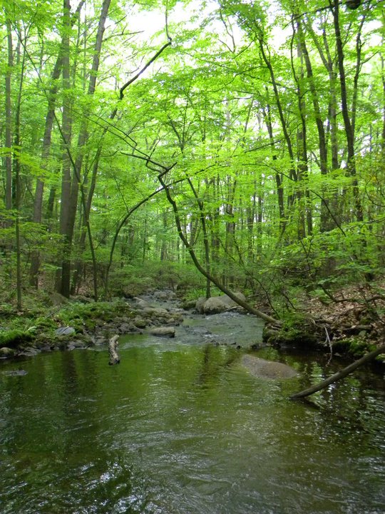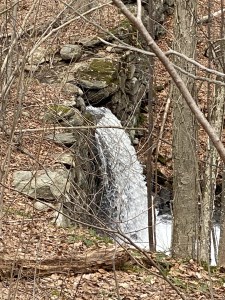 Some fifty-five years ago, when the lower half of Huckins Road was nothing more than a dirt path, impassable to anything short of a jacked-up four wheel drive truck or tank, and the first house was being built, my father would take us for walks there, down this exotic uninhabited Brigadoon, most importantly teaching us to avoid the poison ivy that grew thick on the sides. There were two paths through the forest, and both led to beautiful waterfalls. The near one, across from our property (and loaded with poison ivy), was small, no more than 2-3 feet high, and narrow enough that if you put your feet on the right stones, you could hop across. But further down the road, past Darcey, was a high one, with a pond above it (since badly silted in by the flood of 1982). And by the pond, above the waterfall, were two stone pillars. My father, who not only had two degrees in history but whose babysitter so many eons ago had been the Prospect Town Historian, who could possibly have been born in the 1600’s, told me back then that the pillars had belonged to a mill, to hold a mill wheel driven by the waterfall. The fact there could have been industry nearby made sense to me, since the land and trees between our house and Darcey suggested an old road, and we had come across old coal deposits and odd bits of rusty tools buried in the dirt, waiting for child archeologists to treasure them.