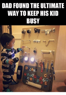 genius. Give the kid all those things he wants to explore, but in one safe location: a real-life busy board. Phones, switches, calculators, all those forbidden things, right in reach, and no one yelling. Finding myself the unexpected guardian and caretaker of an infant and starting all over again, I wanted one of those. As she started to crawl, I built one, too. Wheels for spinning, latches, jingly keys (and old dog license tags), a push-on closet light, a light switch that turns on an actual LED, a small baking sheet for magnets (we use photos of relevant family and friends), interchangeable carabiners with a pacifier, a fun keychain, a small measuring tape that retracts, a mailbox flag that goes up and down, a brush for sensory input, Velcro dots for sticking pictures to (and they feel fun), a light-up keychain, numbers for counting and matching clothespins, an old TV remote, and most importantly – the springy door stoppers that go BOING when you whap them. Fastened to the wood, they make
