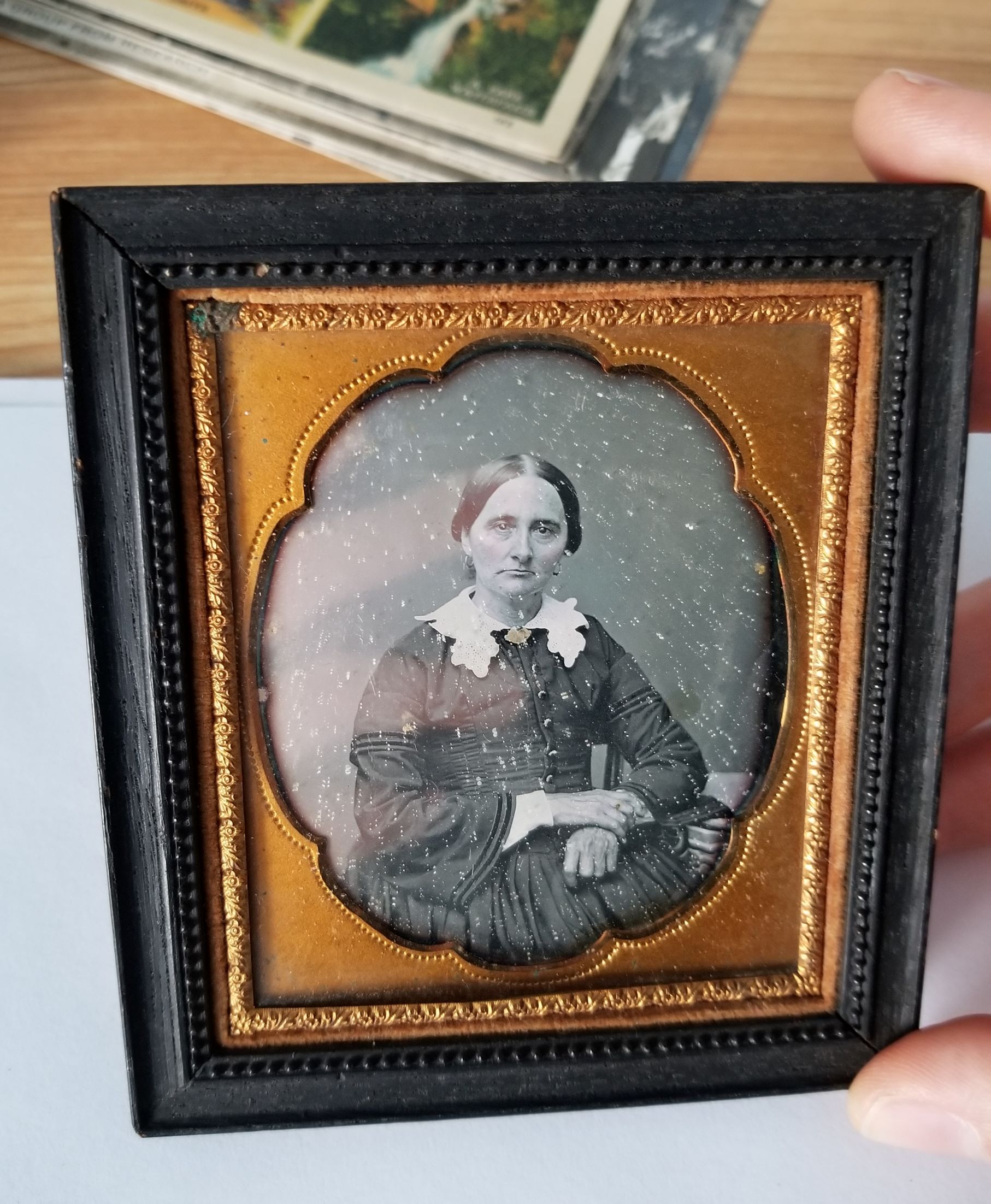 Portrait of an unknown woman, probably from the mid-1800s. This daguerreotype’s reflective qualities distinguish it from the more common ambrotypes and tintypes.