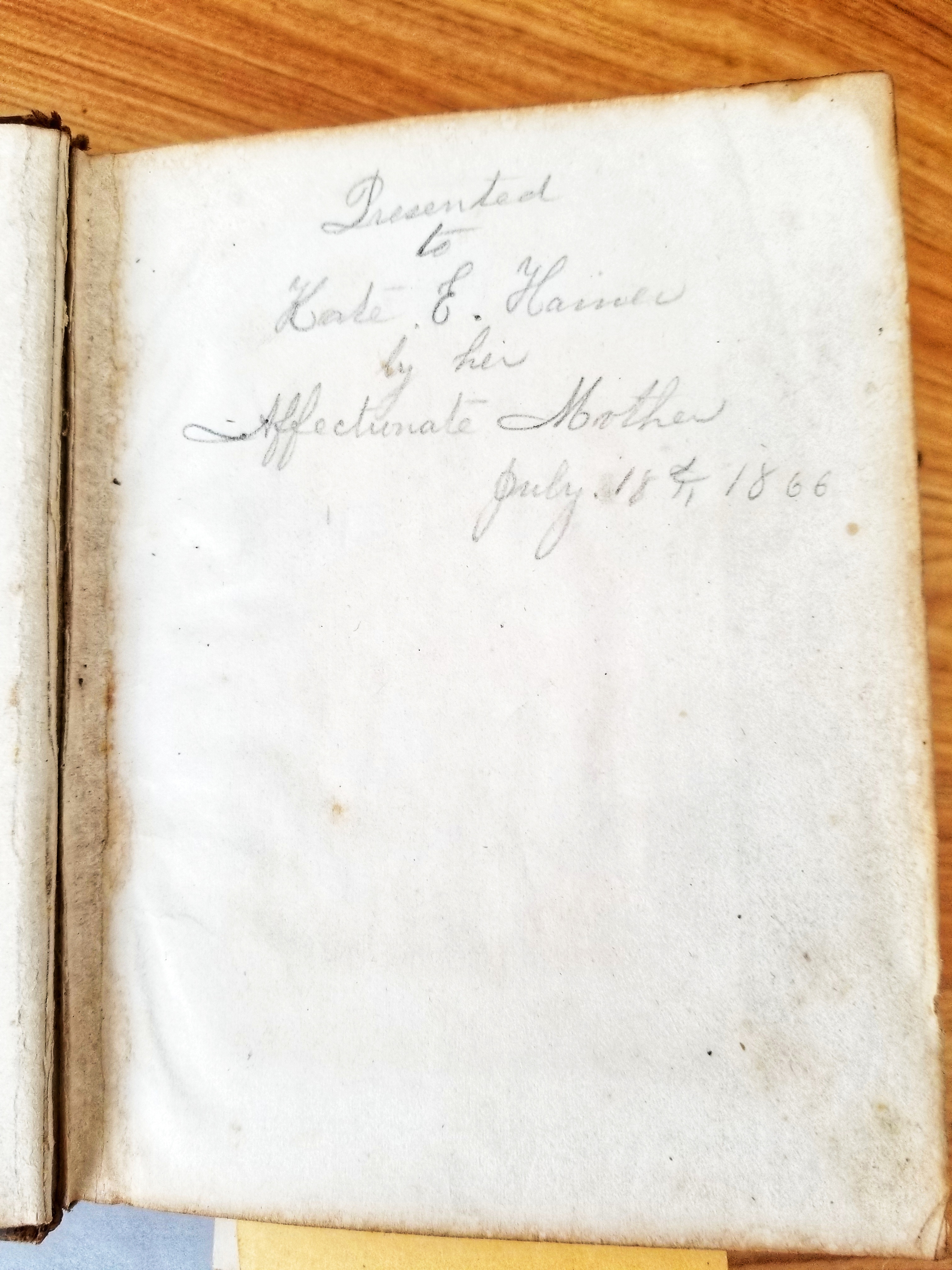 When my grandmother cleaned out her house, I inherited a collection of old photos, documents, and books. Many items were of unknown origins, collected by a long-dead relative and placed in a series of boxes and bags, which in turn was tucked into a closet until it emerged one Sunday afternoon. I was fascinated. I spent hours going through the pages of the books and turning over the photos to see the names. I grew to recognize them, even if I couldn’t exactly connect them to me. Here in this local history book is a Balliet: the name I carried for most of my life. This photo, a Bloss. Here’s a Schneider, a Kern. But nothing haunted me quite like the handwritten inscription that prefaced a photo album: “Presented to Kate E. Haines by her Affectionate Mother, July 18, 1866.”