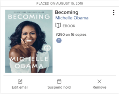 As I write this, the ebook for Michelle Obama’s 2018 memoir, Becoming,  has over 200 people waiting for their turn at one of 16 eBook copies. If each of those 16 copies is checked out for the full lending period of 21 days, well, that’s a very long wait if you’re at the bottom of the list. (Take heart, if you’re using a Cheshire library card, your wait won’t be quite as long.  We have purchased 2 additional copies for Cheshire cardholders exclusively, so CPL users will move through the hold queue a little faster).