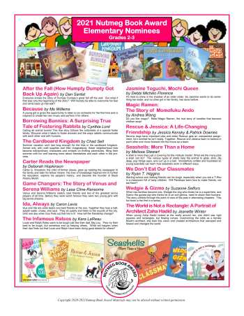 The Nutmeg Book Award is the “Children’s Choice” award for Connecticut, encouraging children across the state to read quality literature. Every year, on May 1, the new nominees for the award are announced. These nominees get grouped into four categories: Elementary (Grades 2-3), Intermediate (Grades 4-6), Middle School (Grades 7-8), and High School (Grades 9-12). Children then have a year to read the nominated titles and vote for their favorite.